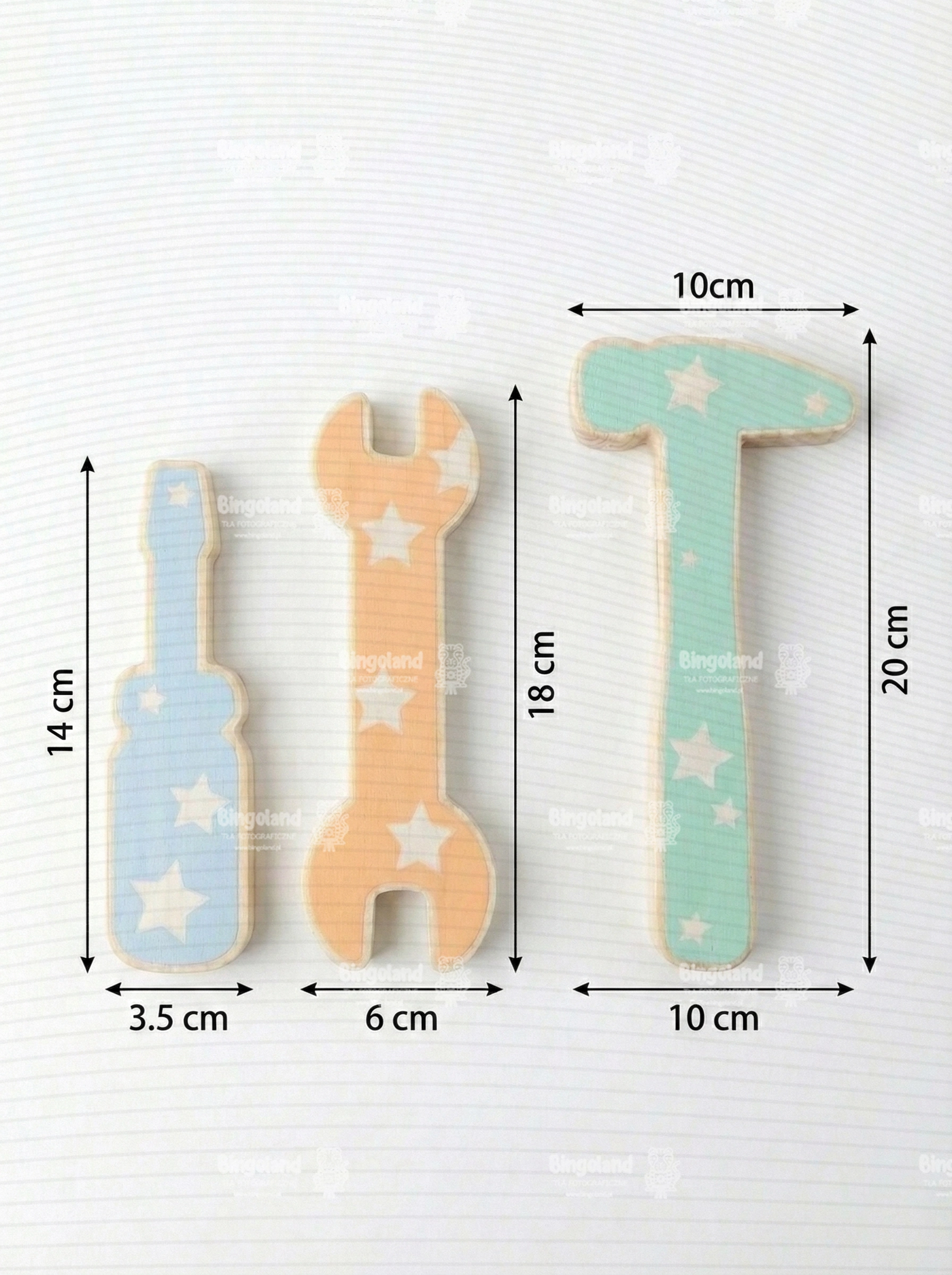 Zestaw trzech drewnianych narzędzi w pastelowych kolorach, przeznaczony jako rekwizyt do profesjonalnych sesji fotograficznych dzieci i niemowląt.