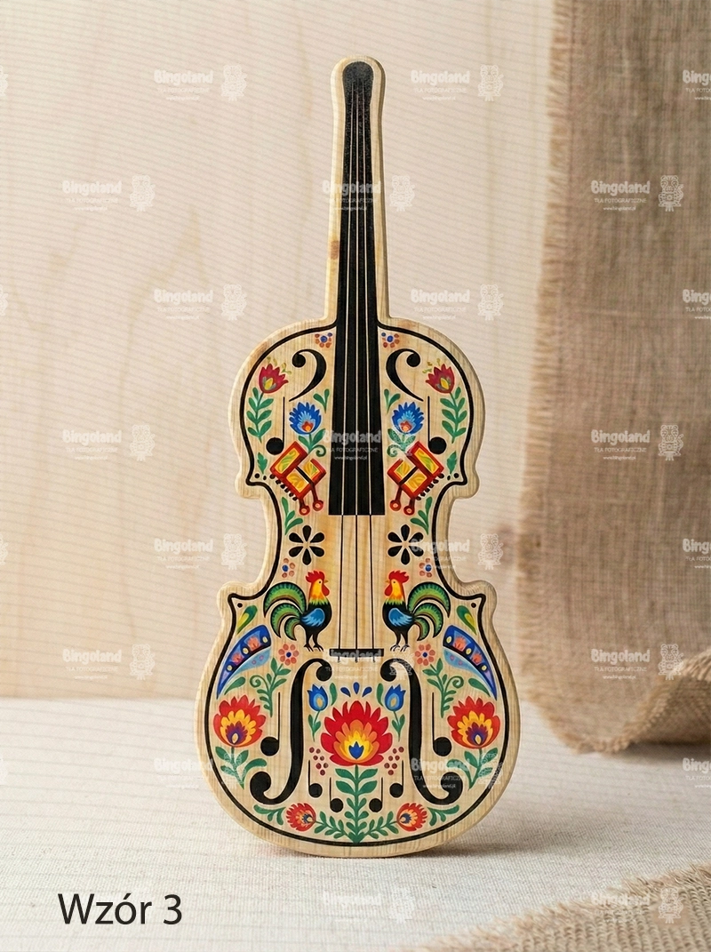 Imponujący rekwizyt muzyczny. Bogate zdobienia etno (kwiaty, nuty, koguty) czynią go niezwykle fotogenicznym. Świetny do zdjęć stylizowanych na małych muzykantów.