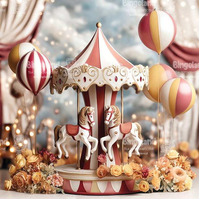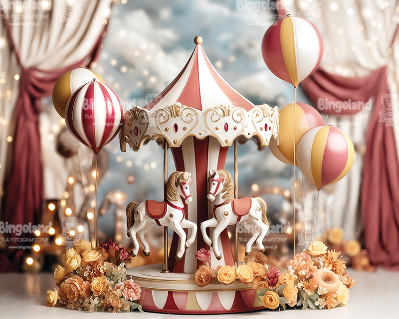 karuzela, tło fotograficzne, karnawałowe tło, retro funfair, carousel backdrop, konie na karuzeli, balony, kurtyny teatralne, bokeh świateł, złote akcenty, pastelowe kolory, morela i złoto, pudrowy róż, bordo, błękit nieba, romantyczne tło, eleganckie tło, vintage circus, showtime backdrop, sesja dziecięca, sesja rodzinna, urodziny, mini sesje, sesja karnawałowa, photobooth, studio photo backdrop, sweet carnival, fairground, lampki girlandy, kwiaty w ciepłych tonach, glamour retro, tło do zdjęć produktów, instagram backdrop, tło eventowe, funfair tickets, magic show props
