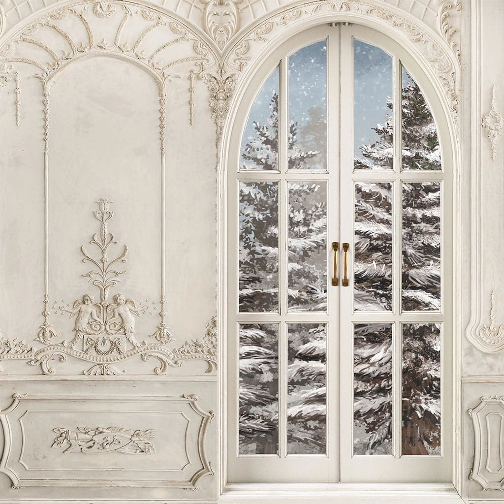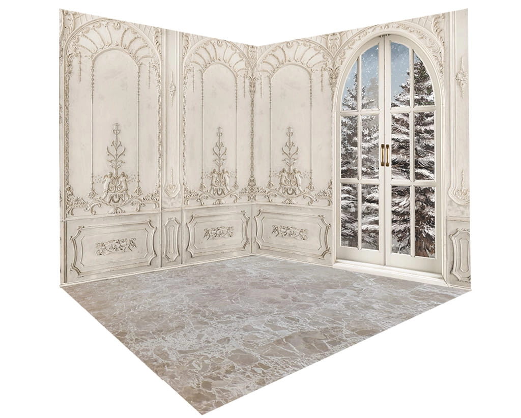 Tło fotograficzne świąteczne , Boże Narodzenie , Tło do zdjęć Świątecznych , wnętrze , zima , okno , marmur , sztukateria. Tło Fotograficzne narożne stylowe wnętrze.