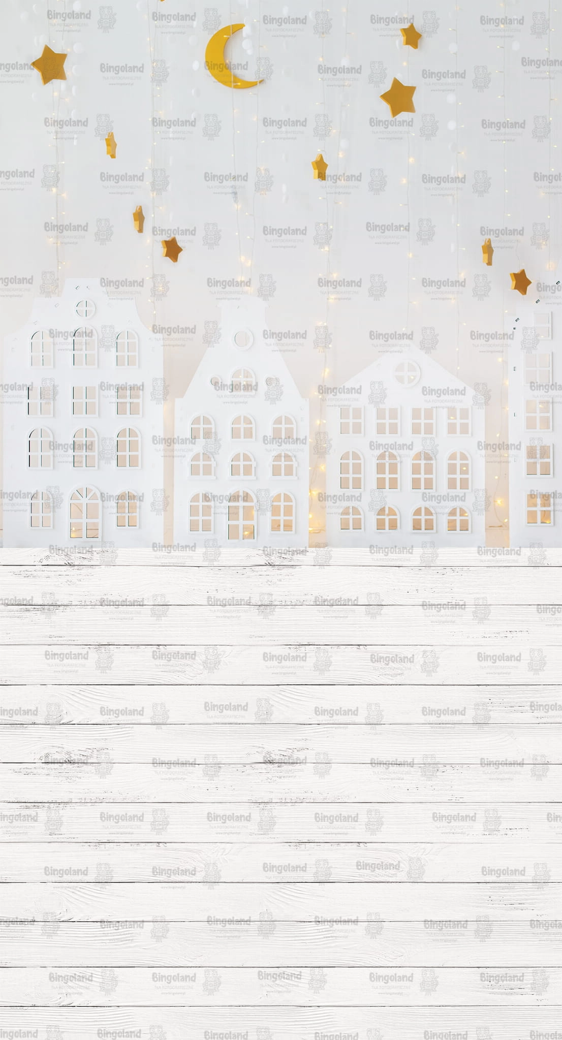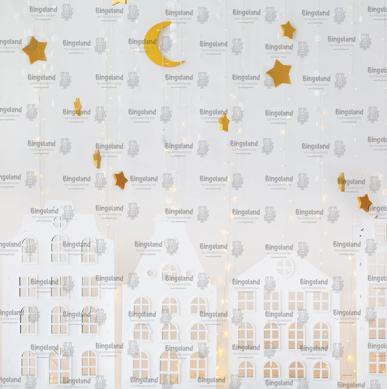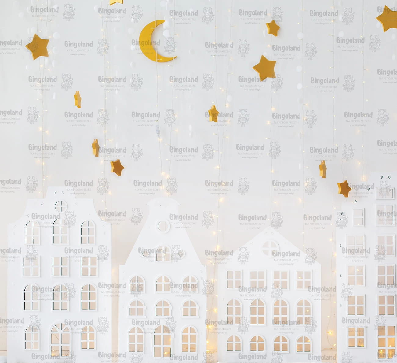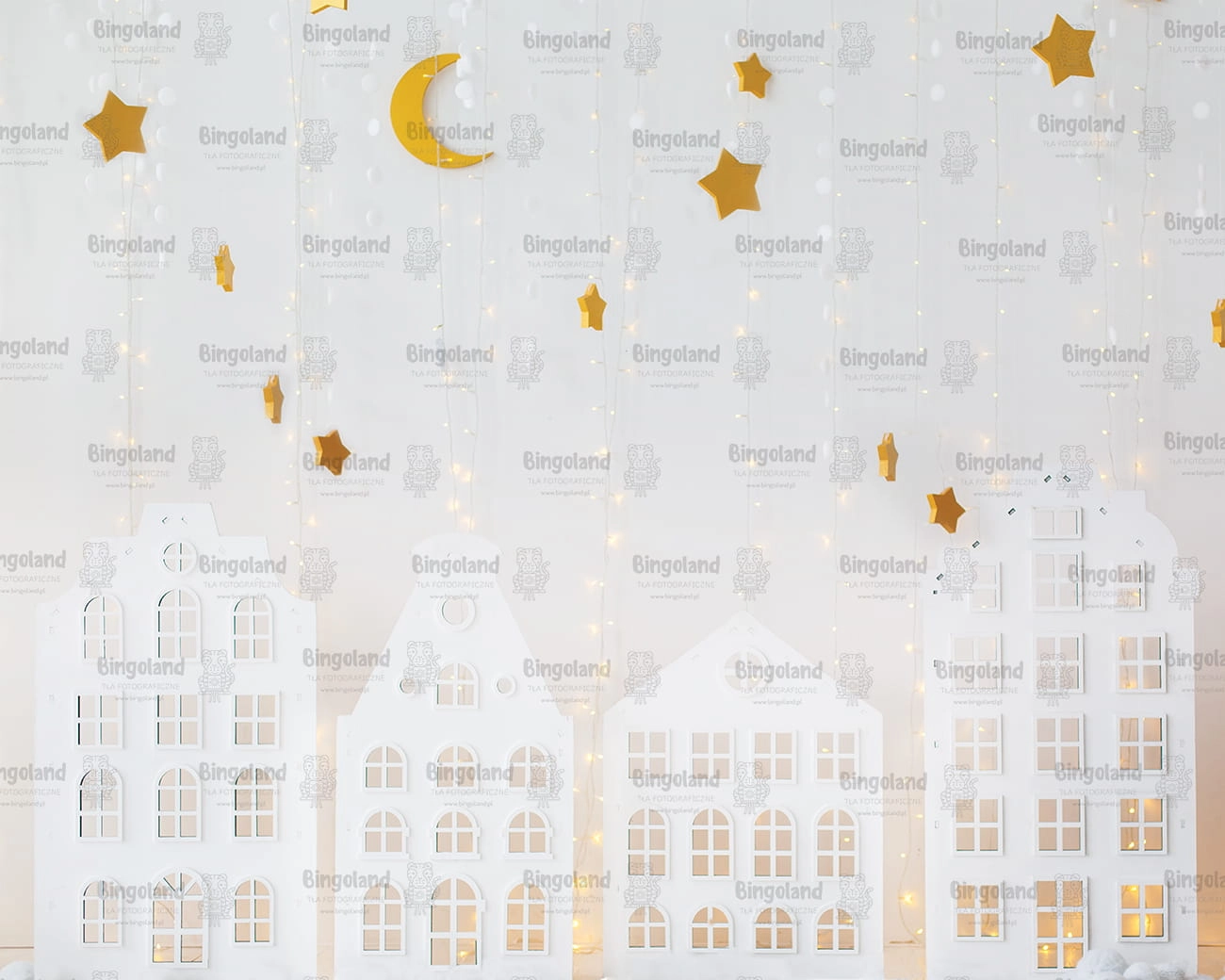 Tło fotograficzne świąteczne , Boże Narodzenie , światełka , białe , domki. Tło do zdjęć świątecznych.