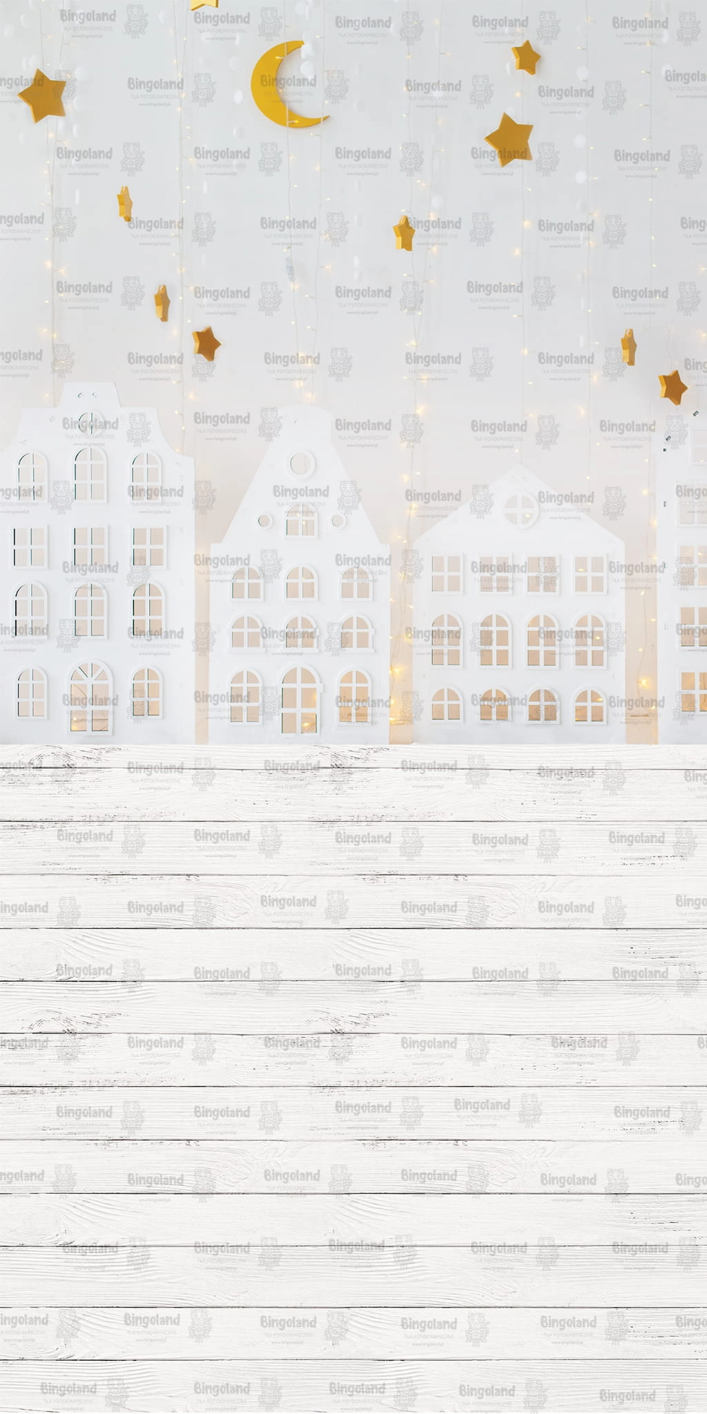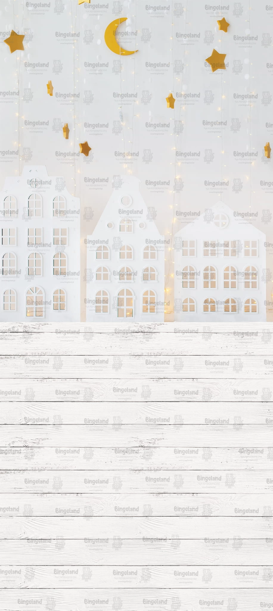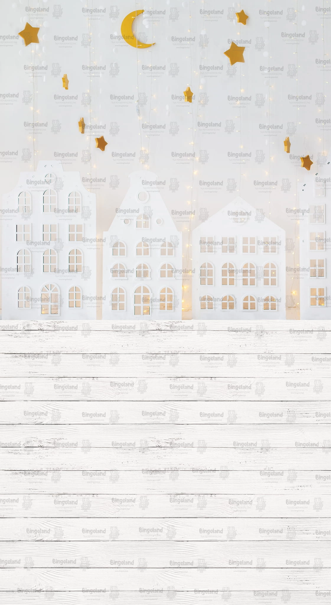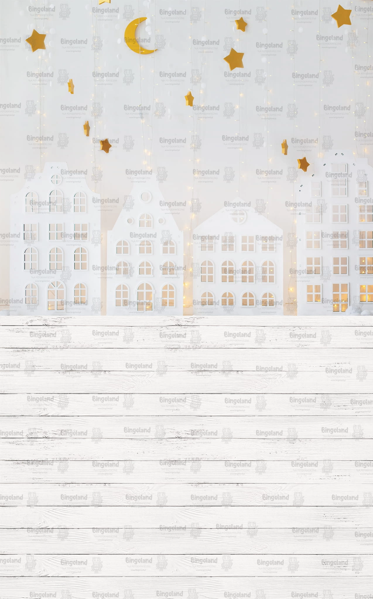 Tło fotograficzne świąteczne , Boże Narodzenie , światełka , białe , domki. Tło do zdjęć świątecznych.