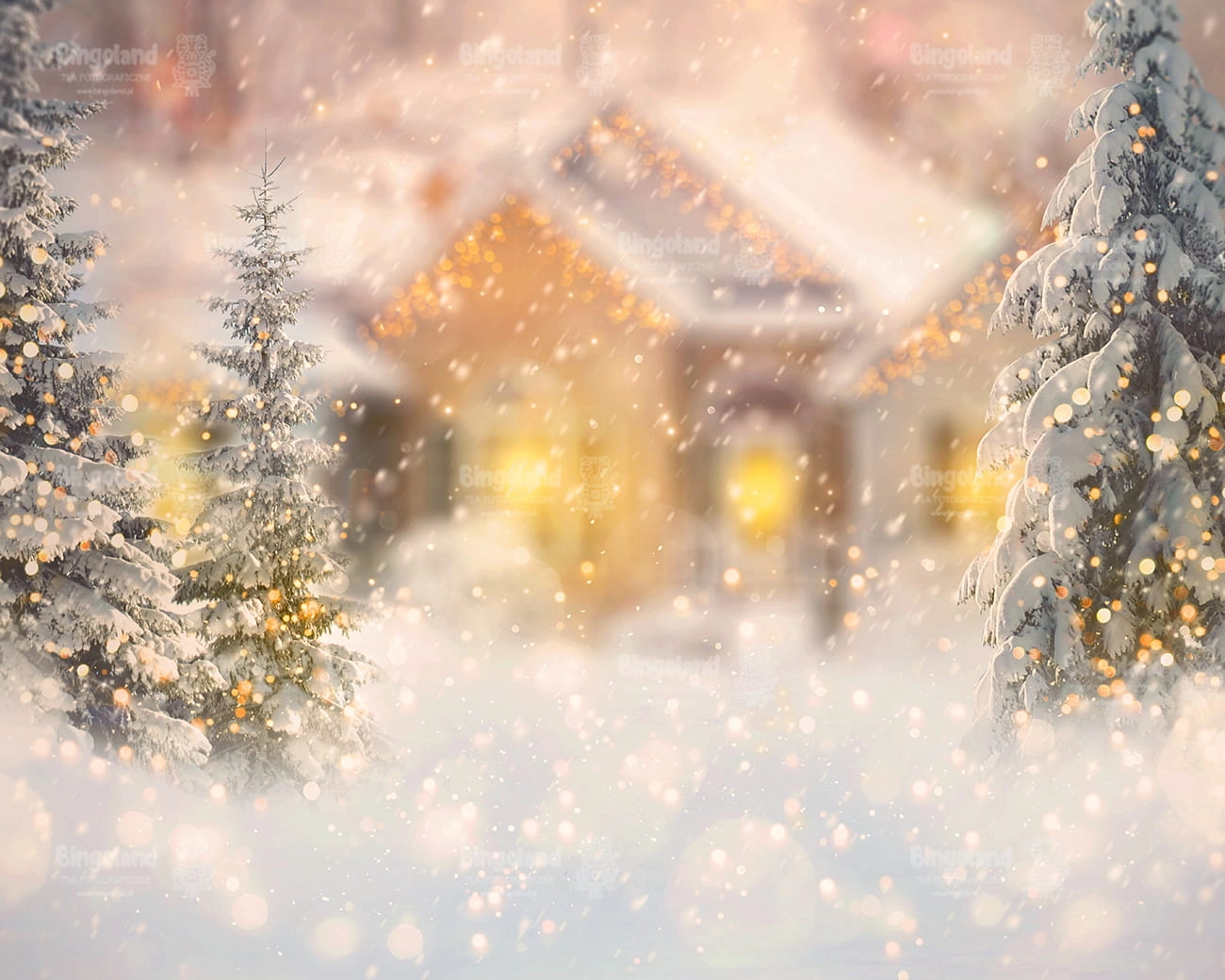 Tło fotograficzne Boże Narodzenie , święta , domek ,śnieg , las , drzewa, światełka. Tło do zdjęć Świątecznych.
