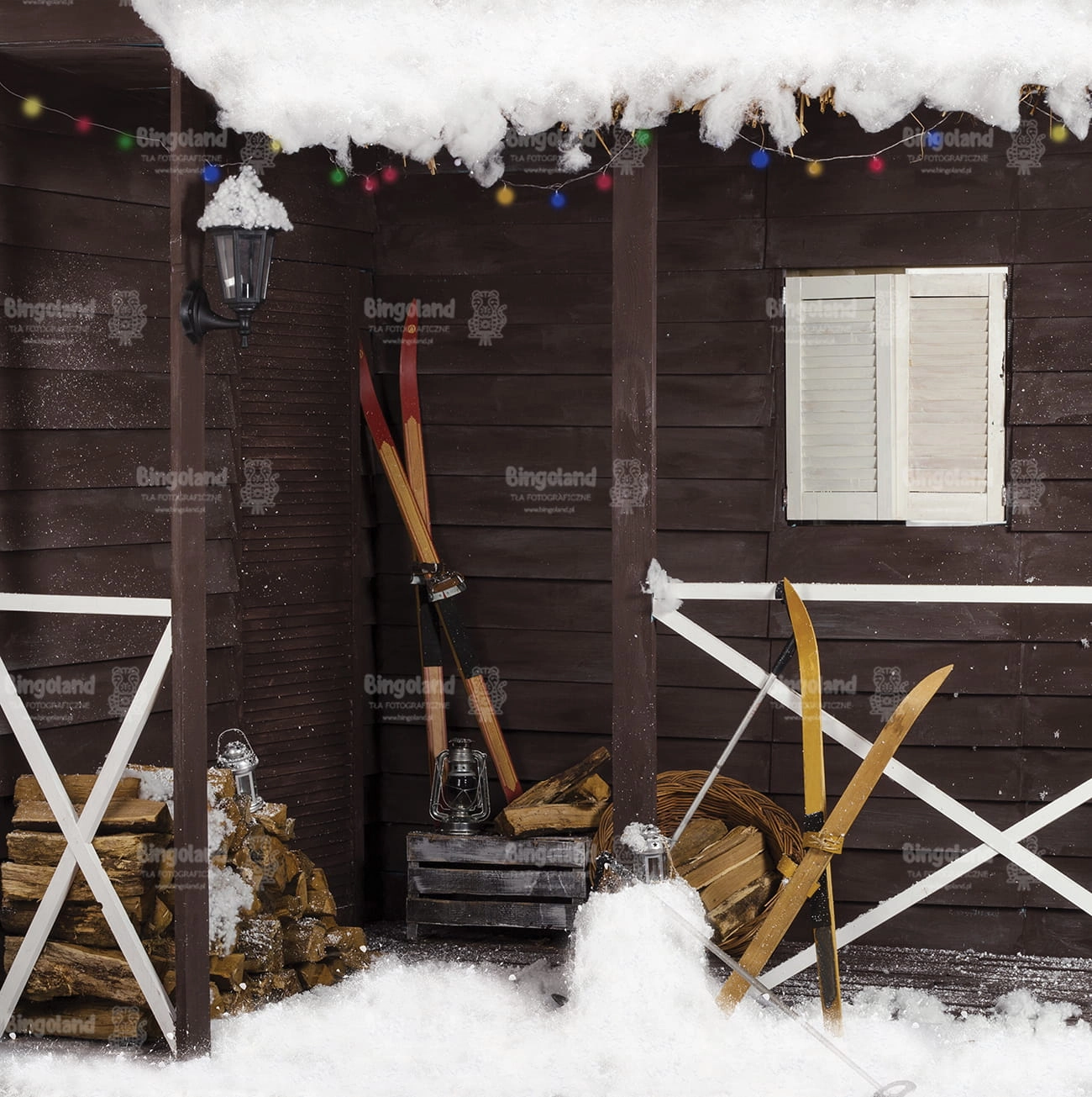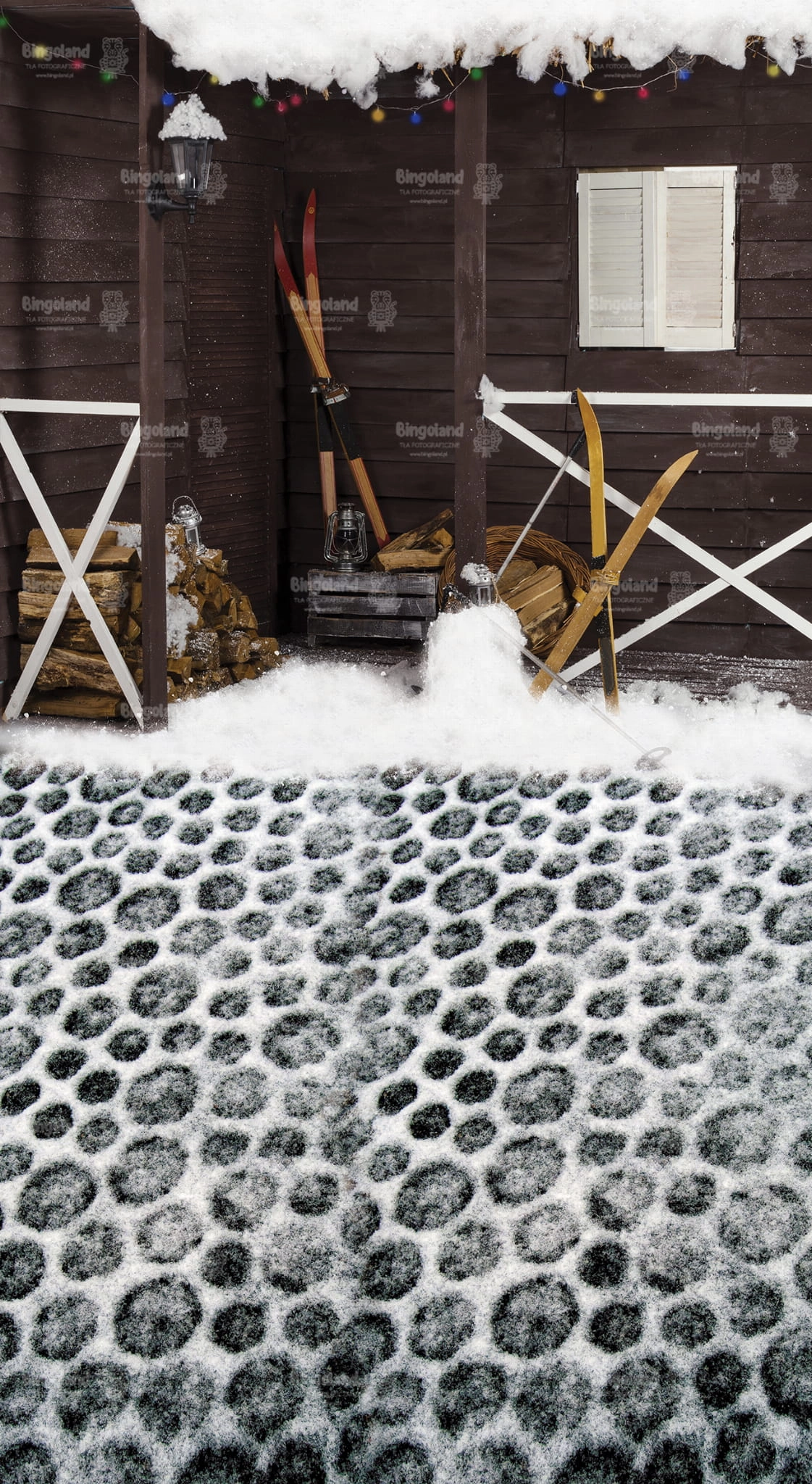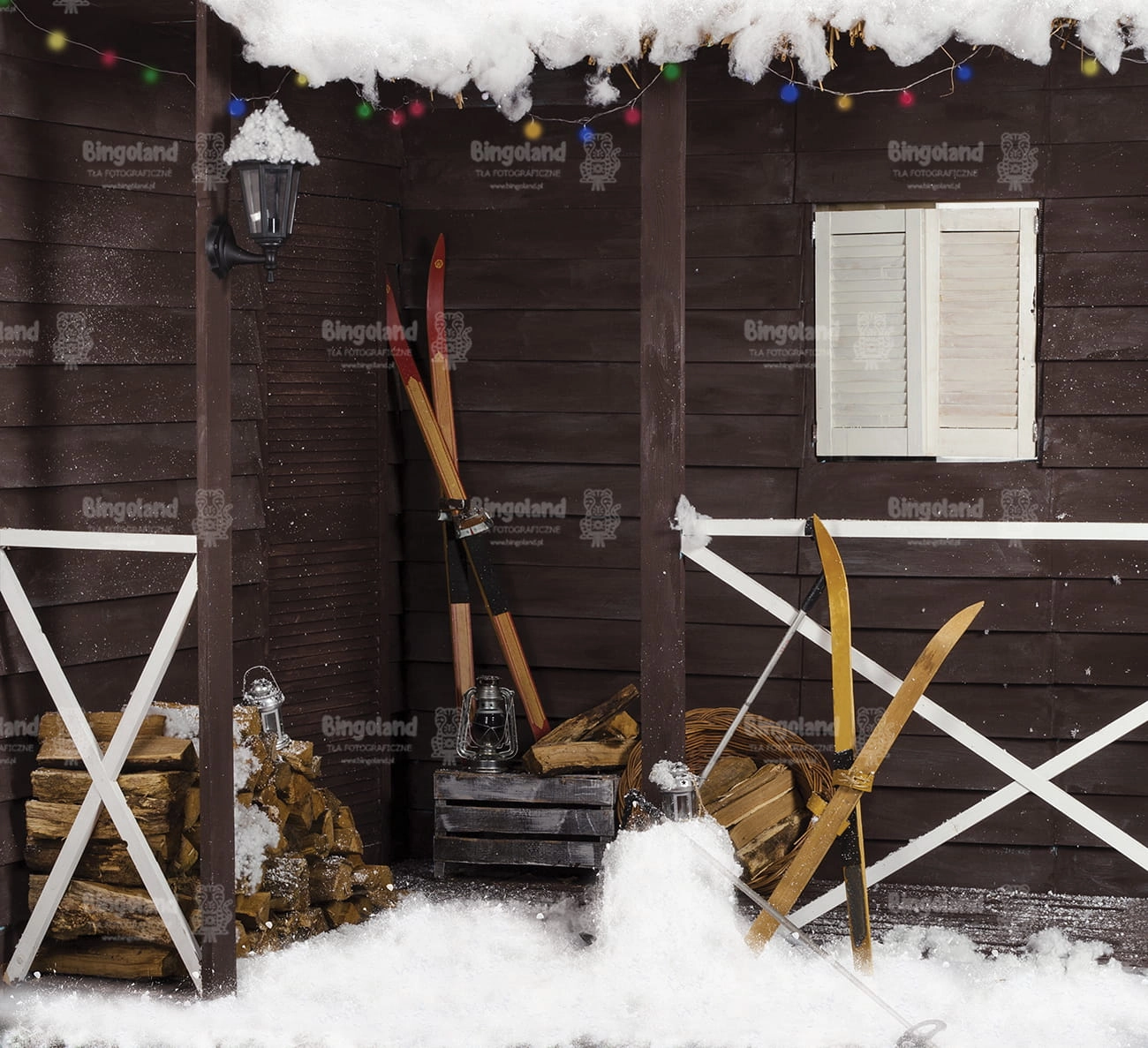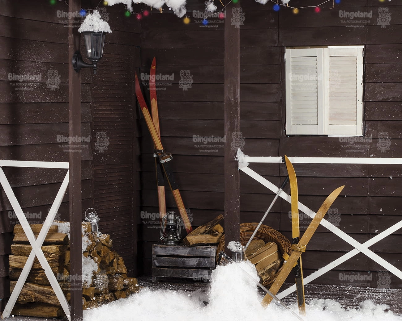 Tło fotograficzne świąteczne , Boże Narodzenie , weranda , narty , śnieg , domek ,drewno. Tło do zdjęć zimowych.