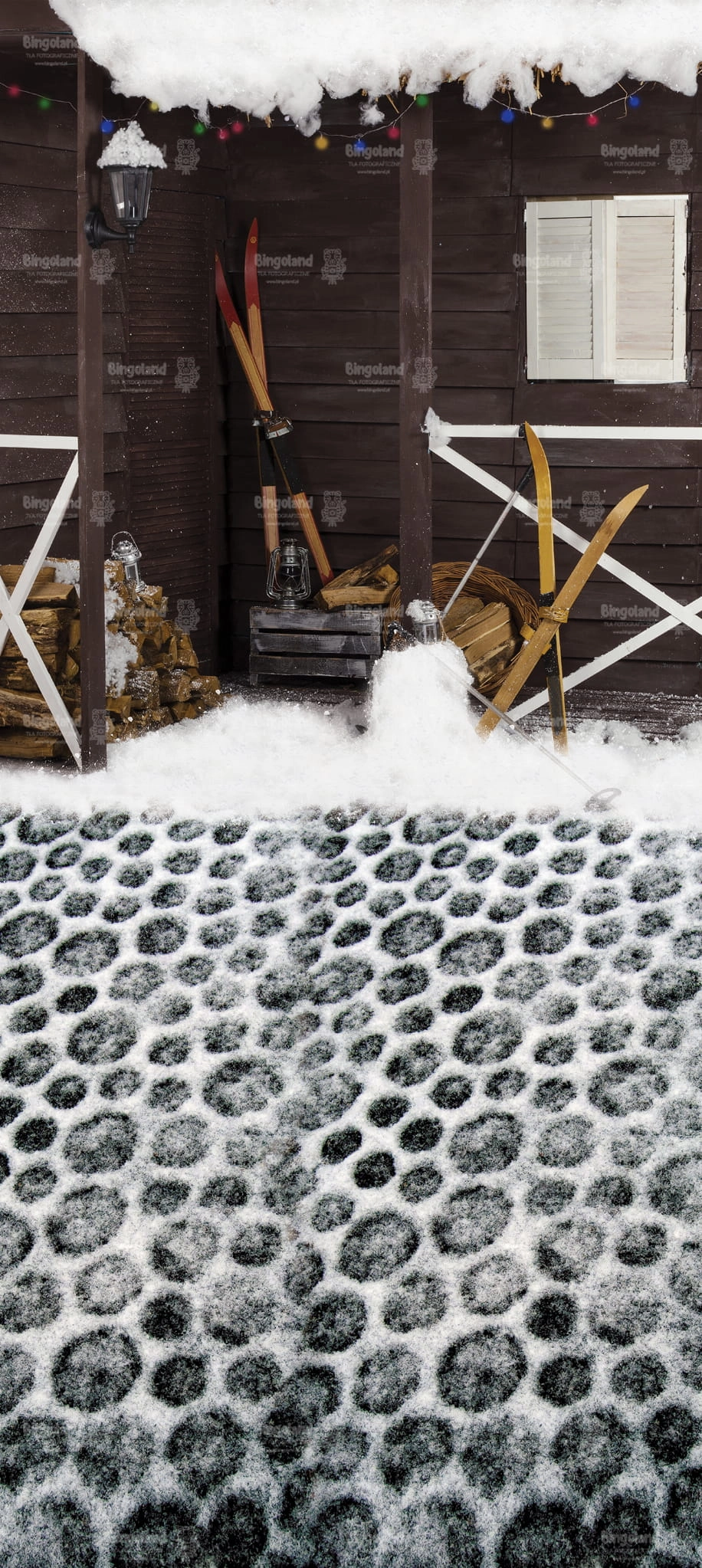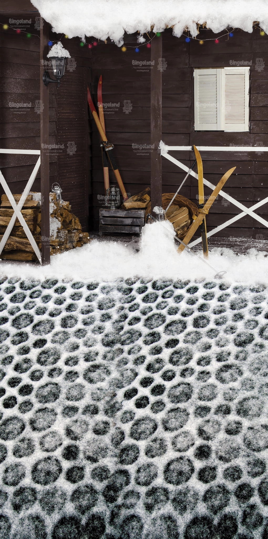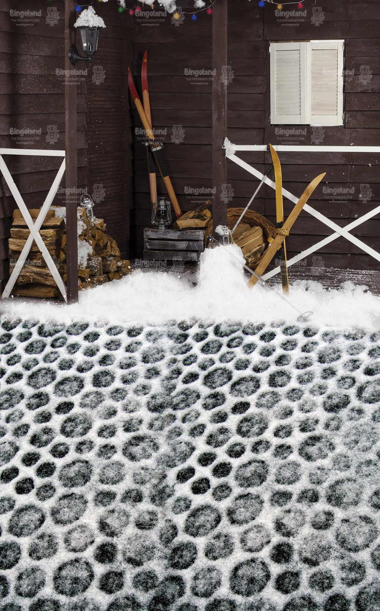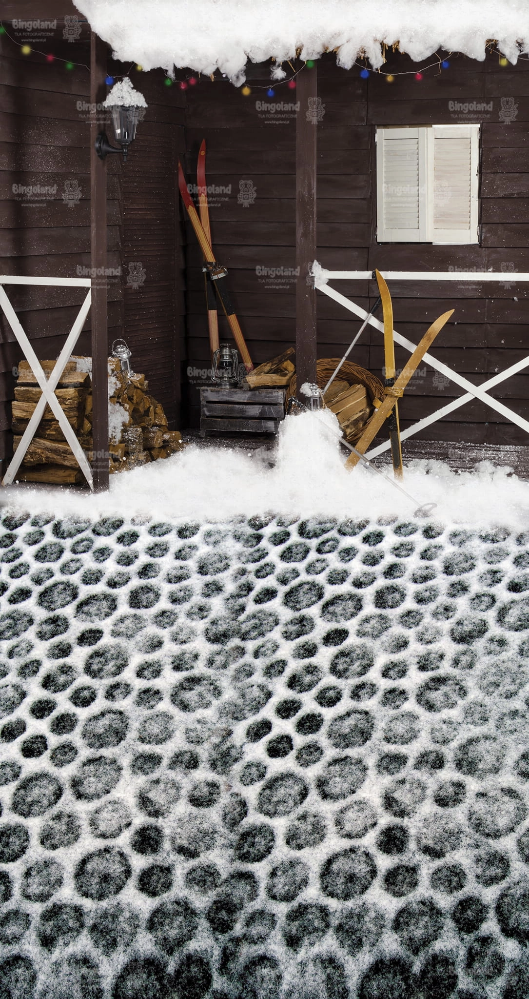 Tło fotograficzne świąteczne , Boże Narodzenie , weranda , narty , śnieg , domek ,drewno. Tło do zdjęć zimowych.