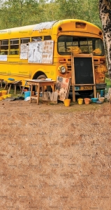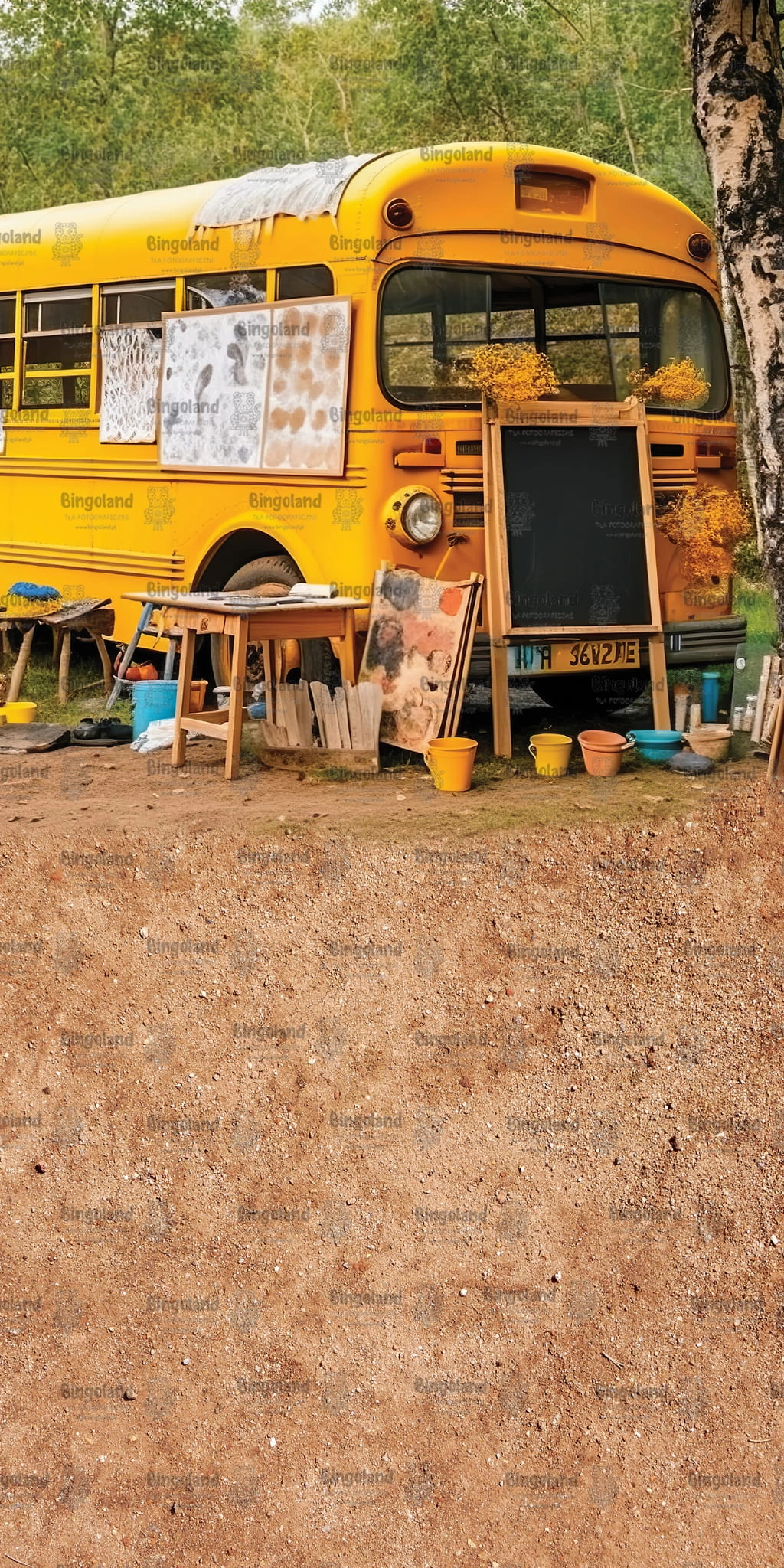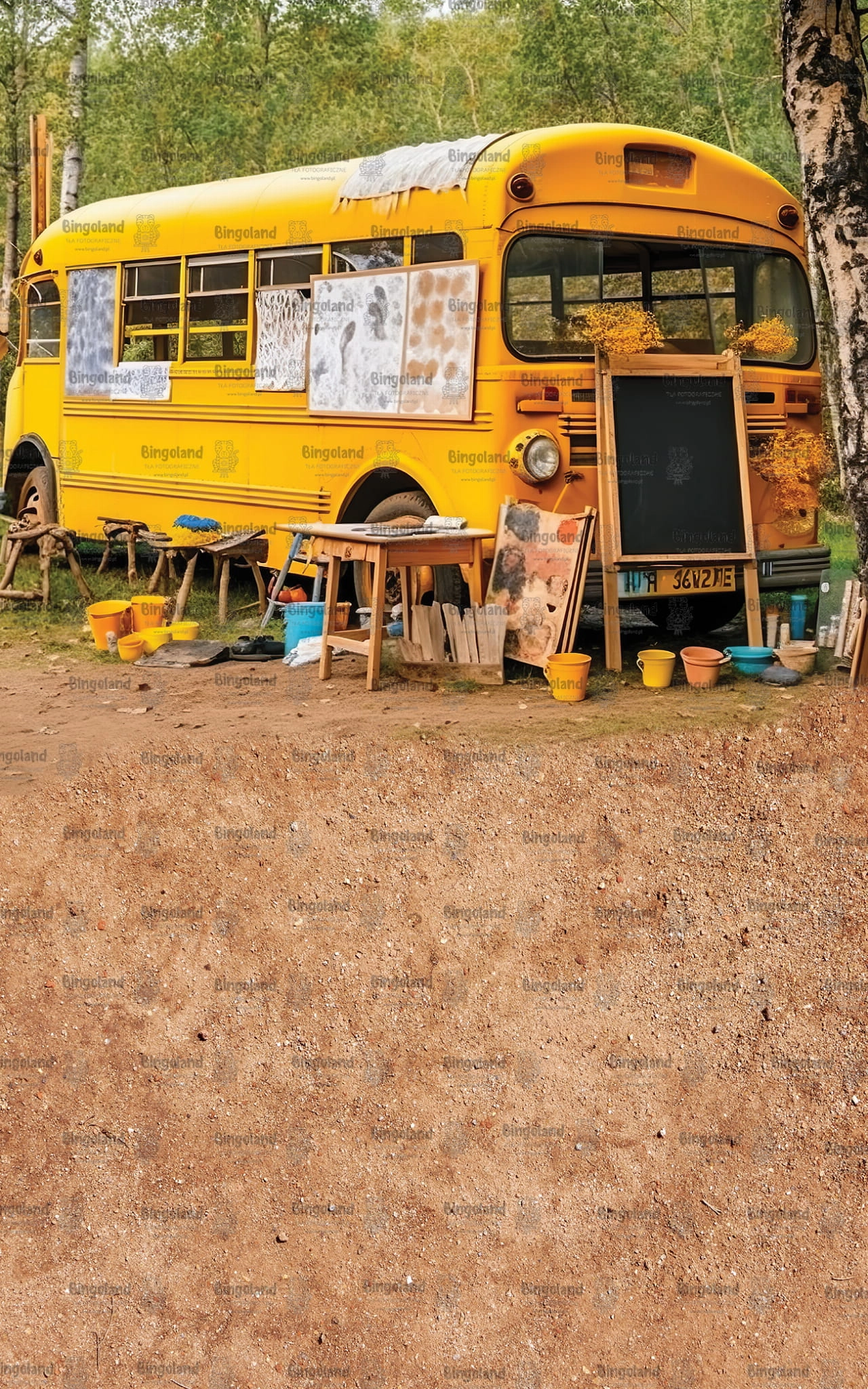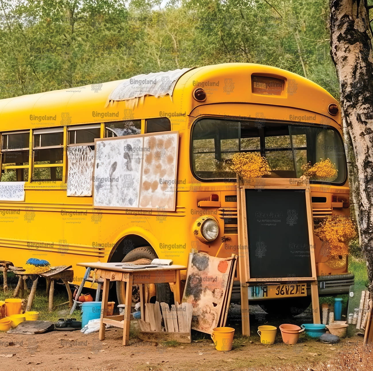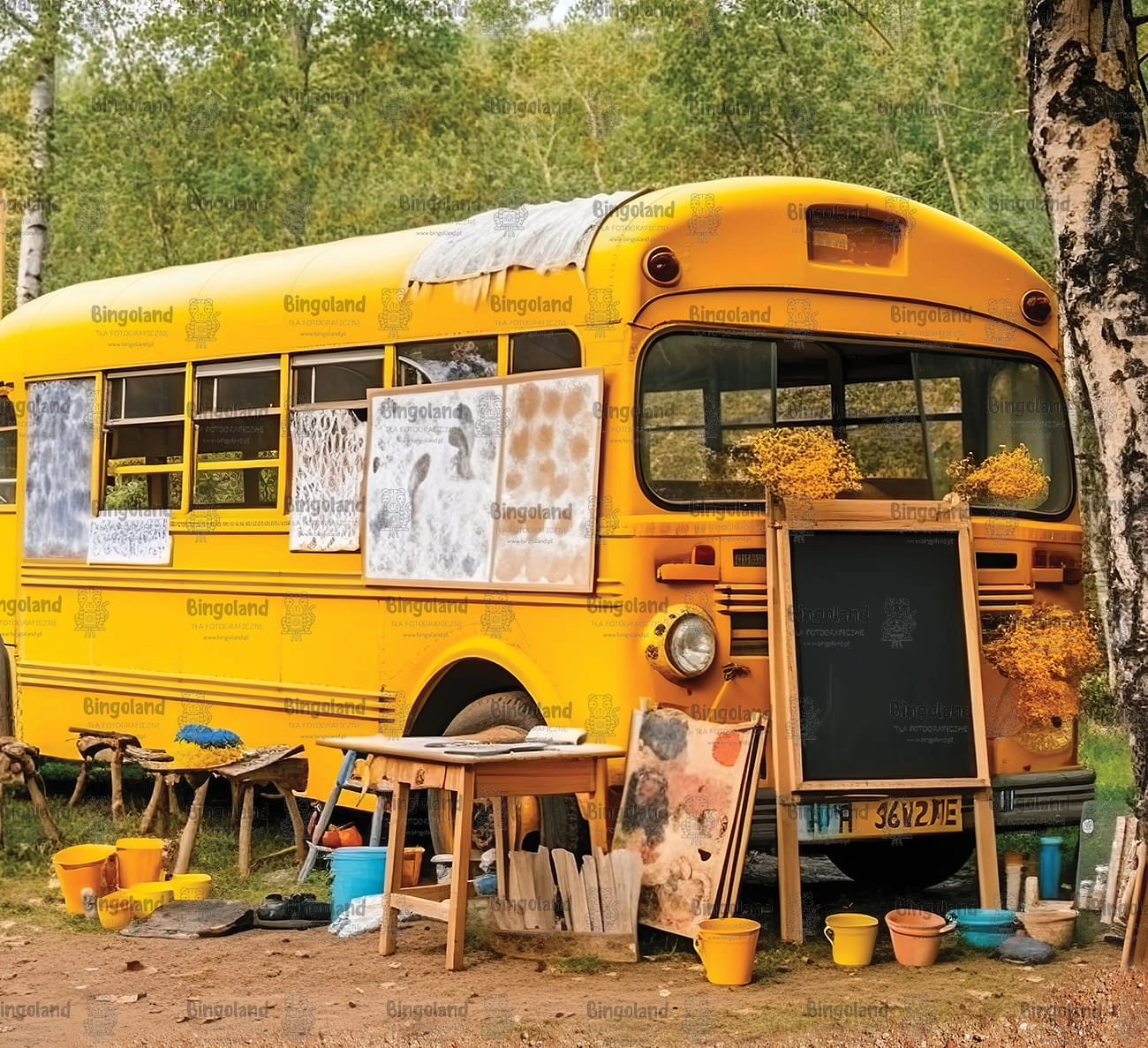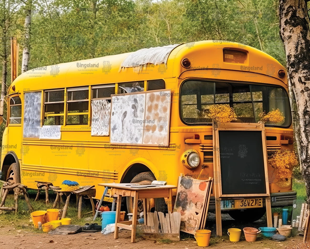 Piękne tło fotograficzne przedstawiające charakterystyczny żółty autobus szkolny w stylu amerykańskim. Na zdjęciu autobus stoi w lesie, tworząc niepowtarzalną i nostalgiczna atmosferę. Obok autobusu są poustawiane przybory szkolne, takie jak ławka i tablica, co nadaje temu tłu jeszcze większej autentyczności.