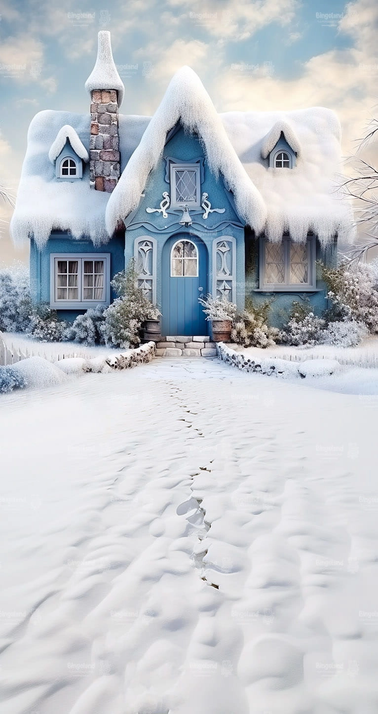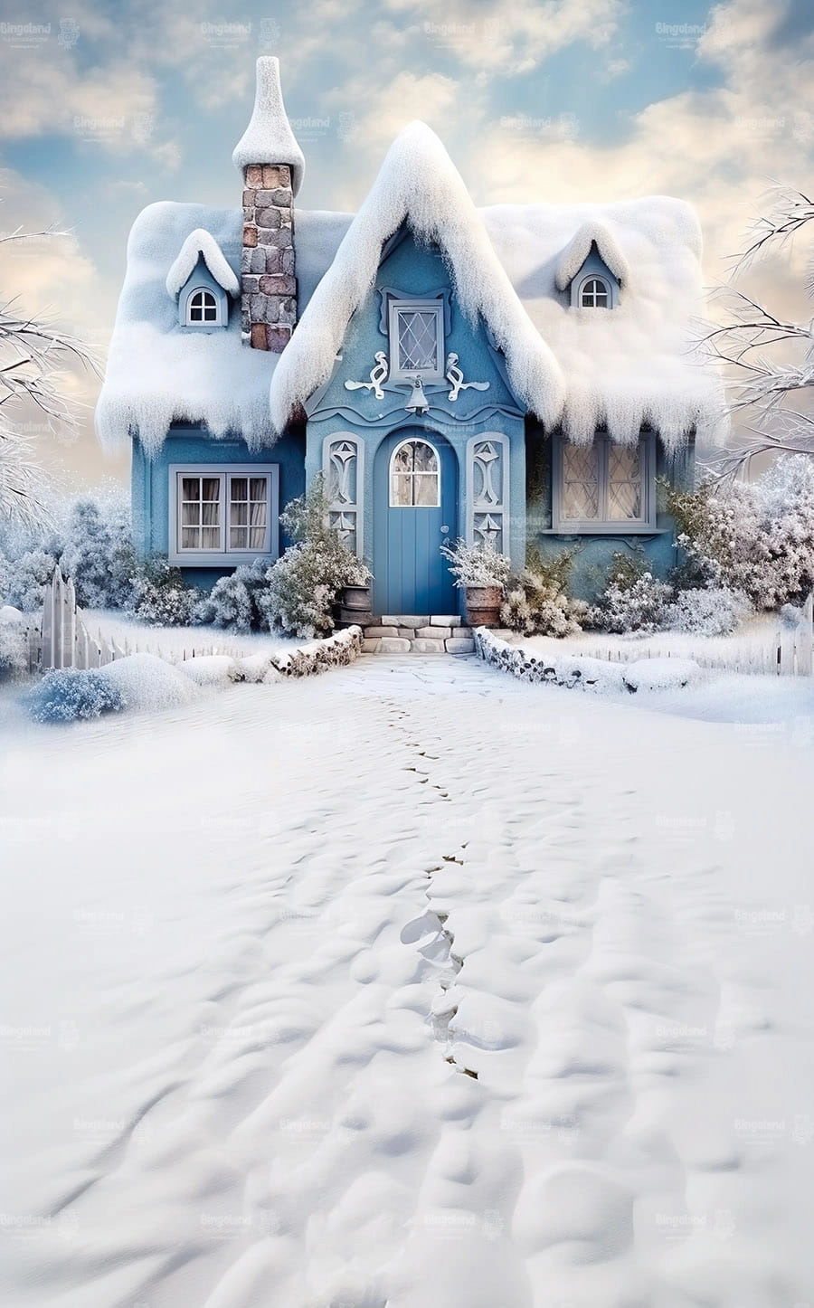 Zaopatrz się w nasze tło fotograficzne przedstawiające bajkowy drewniany niebieski domek pośród śniegu i pozwól swojej wyobraźni rozwinąć skrzydła. Przenieś się do magicznej krainy pełnej czarów i niezapomnianych chwil.