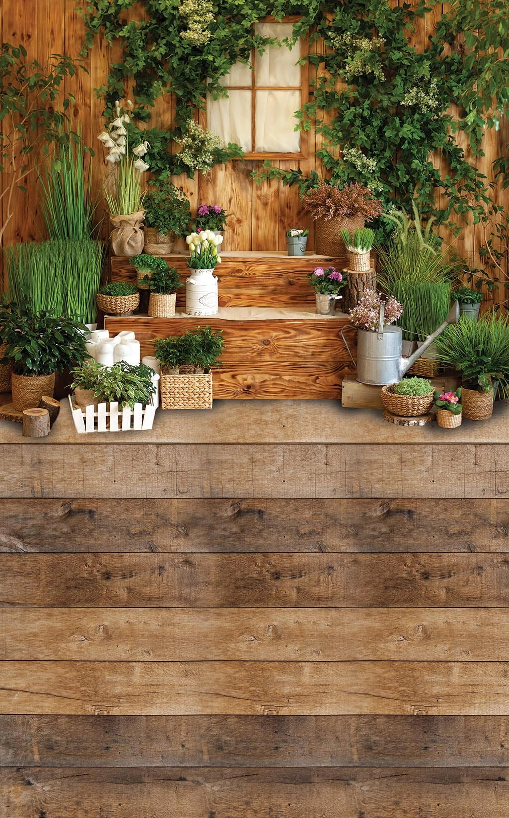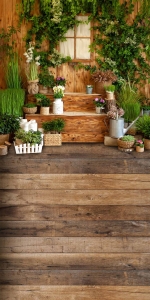 Tło fotograficzne wiosna wiosenne ,wiosenna aranżacja , rośliny ,zieleń , deski , okno.