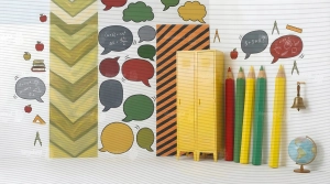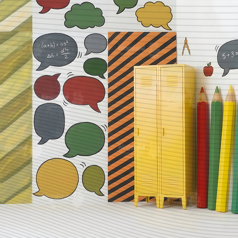 - Edukacyjne Inspiracje: Tło wypełnione jest ikonami nauki: gigantycznymi kredkami, globusem, kompasami, mosiężnym dzwonkiem, stosami książek i jabłkami, a także zabawnymi dymkami z równaniami matematycznymi i schematami.