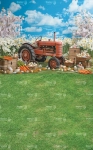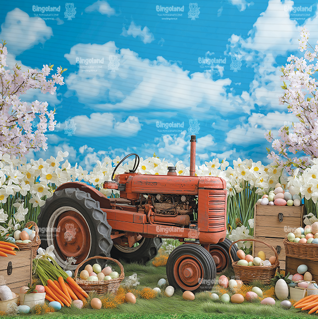 Gotowi na wielkanocną przejażdżkę? Tło "Wiosenna Przygoda na Farmie" to energetyczna i pełna życia kompozycja, która skradnie serca małych modeli (i ich rodziców!). Dominujący, klasyczny czerwony traktor w otoczeniu białych narcyzów i kwitnących drzew wiśni tworzy idealną scenerię do radosnych, dynamicznych zdjęć.