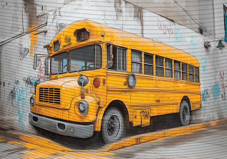 - Motyw: Realistyczny mural 3D z kultowym amerykańskim autobusem szkolnym.