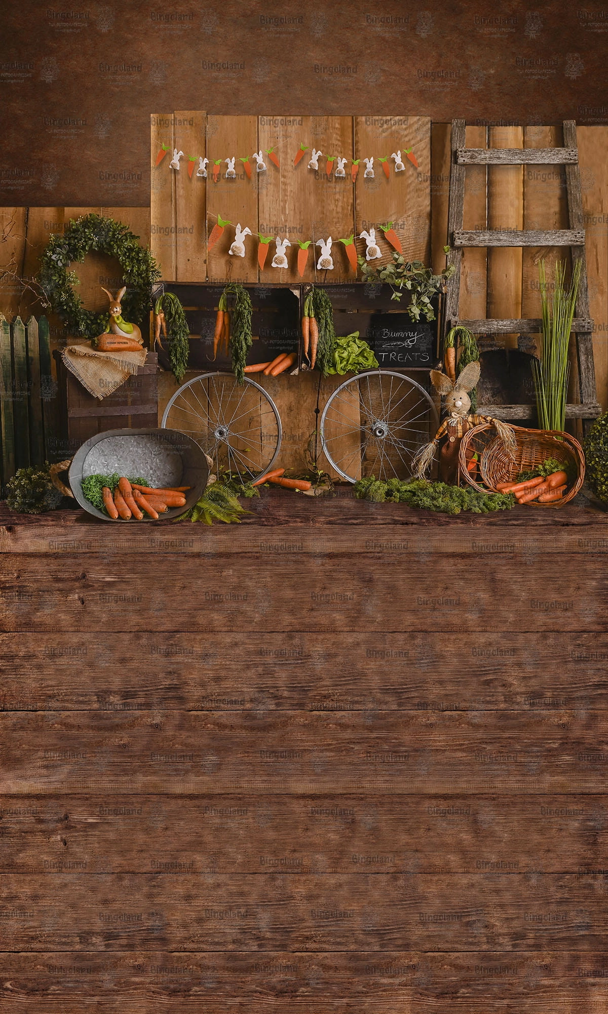 W skład tła wchodzą wiadra i skrzynki z marchewkami oraz drewniane elementy, które dodają uroku i przytulnego klimatu.