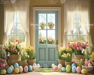 To tło przedstawia idylliczne domowe wejście, otoczone świeżymi, wiosennymi kwiatami i pastelowymi pisankami, które wprowadzają radosny, świąteczny nastrój. Idealne do rodzinnych zdjęć, portretów dzieci oraz sesji produktowych, to tło stworzy ciepłą i przytulną atmosferę każdej fotografii. Pozwól, by wiosenna świeżość i delikatne barwy uczyniły Twoje zdjęcia niezapomnianymi.