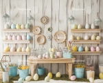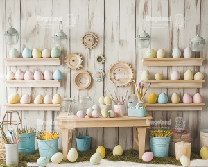Wprowadź wiosenną świeżość do swoich zdjęć z naszym Wielkanocnym Tłem z Pastelowymi Jajkami. To urocze tło, inspirowane rustykalnym stylem, oferuje delikatną paletę pastelowych barw – idealną do sesji zdjęciowych związanych z Wielkanocą i wiosną. Na tle znajdziesz drewniane półki wypełnione kolorowymi jajkami, stół z akcesoriami do malowania oraz subtelne dekoracje, które dodają ciepła i przytulności. To tło sprawdzi się świetnie zarówno w profesjonalnej fotografii, jak i przy domowych sesjach, tworząc wyjątkowy, świąteczny nastrój.