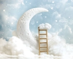 Na tym tle fotograficznym widoczny jest duży, biały półksiężyc z fakturą przypominającą powierzchnię księżyca. Wokół niego unoszą się puszyste, białe chmury, a w tle widnieje gwiaździste, błękitne niebo. Na księżyc prowadzi drewniana drabina, która dodaje bajkowego, marzycielskiego klimatu. Tło sprawia wrażenie sceny wyjętej z dziecięcych snów, idealnej do sesji zdjęciowych o tematyce nocnej lub baśniowej.