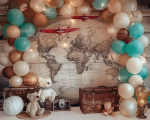 Tło fotograficzne urodziny , roczek , przedszkole , adventure , balony ,mapa