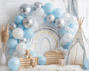 Tło fotograficzne urodziny , roczek , przedszkole , tipi , pastelowe , niebieskie , balony , boho