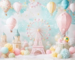 Zapraszamy do magicznego świata dziecięcej fantazji! Tło fotograficzne "Pastelowy Karnawał" to doskonały wybór na sesje urodzinowe, roczkowe, przedszkolne i karnawałowe. Zdominowane przez delikatne pastelowe kolory, bajkowe detale, takie jak różowy diabelski młyn, balony na gorące powietrze oraz fantazyjne zamkowe wieże, tworzy niepowtarzalny klimat beztroski i radości.