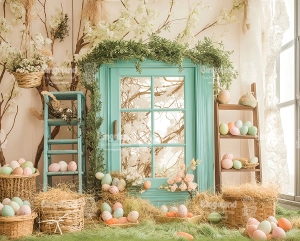 Tło przedstawia wiosenną, wielkanocną scenerię w rustykalnym stylu. Centralnym elementem jest okno z turkusowymi, postarzałymi ramami, ozdobione girlandami z zielonych gałązek, kolorowych pisanek i marchewek. Wokół okna znajdują się dekoracje: drewniane skrzynki, drabinki i koszyki wypełnione jajkami, sianem i zielenią. Na podłożu znajduje się sztuczna trawa z rozrzuconymi pisankami i marchewkami. Całość uzupełniają figurki białych królików oraz ciepłe lampki, które nadają przytulnego klimatu.