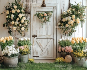 Wprowadź do swoich zdjęć ciepło i urok wiosny dzięki wyjątkowemu tłu fotograficznemu "Wiosenne drzwi i kwiaty". To piękne tło przedstawia rustykalne, białe drzwi w stylu vintage, otoczone bujnymi kompozycjami kwiatowymi w pastelowych kolorach. Żółte i białe tulipany, kremowe róże oraz delikatne akcenty zieleni tworzą harmonijną, naturalną scenerię. Całość uzupełniają detale, takie jak metalowe lampiony i subtelne dekoracje, które dodają tłu przytulnego charakteru.