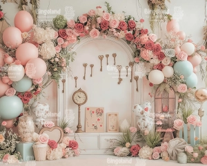 Przenieś się do magicznego świata pełnego tajemnic i baśni dzięki temu wyjątkowemu tłu fotograficznemu. Tło nawiązuje do motywów z Alicji w Krainie Czarów poprzez elementy takie jak ozdobne klucze, zegar w stylu vintage i romantyczne dekoracje. Pastelowe balony, różnorodne kwiaty oraz subtelne detale tworzą atmosferę pełną magii i fantazji, idealną na sesje zdjęciowe inspirowane baśniami.