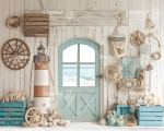 Odkryj wyjątkowe tło fotograficzne w stylu morskim, które przeniesie Twoje sesje zdjęciowe wprost na nadmorską plażę! Dekoracje takie jak latarnia morska, muszle, sieci rybackie, drewniane skrzynki i koła sterowe tworzą niepowtarzalny klimat wybrzeża. Subtelne połączenie bieli, błękitu i naturalnego drewna sprawia, że tło jest uniwersalne i ponadczasowe.
