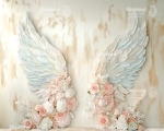 Dodaj magii swoim zdjęciom dzięki unikalnemu tłu fotograficznemu “Skrzydła z kwiatami 3D”. To wyjątkowe tło przedstawia delikatne, trójwymiarowe skrzydła w pastelowych odcieniach błękitu i kremu, ozdobione pięknymi, przestrzennymi kwiatami w subtelnych różach i bieli. Idealne do sesji ślubnych, komunijnych, dziecięcych oraz artystycznych.