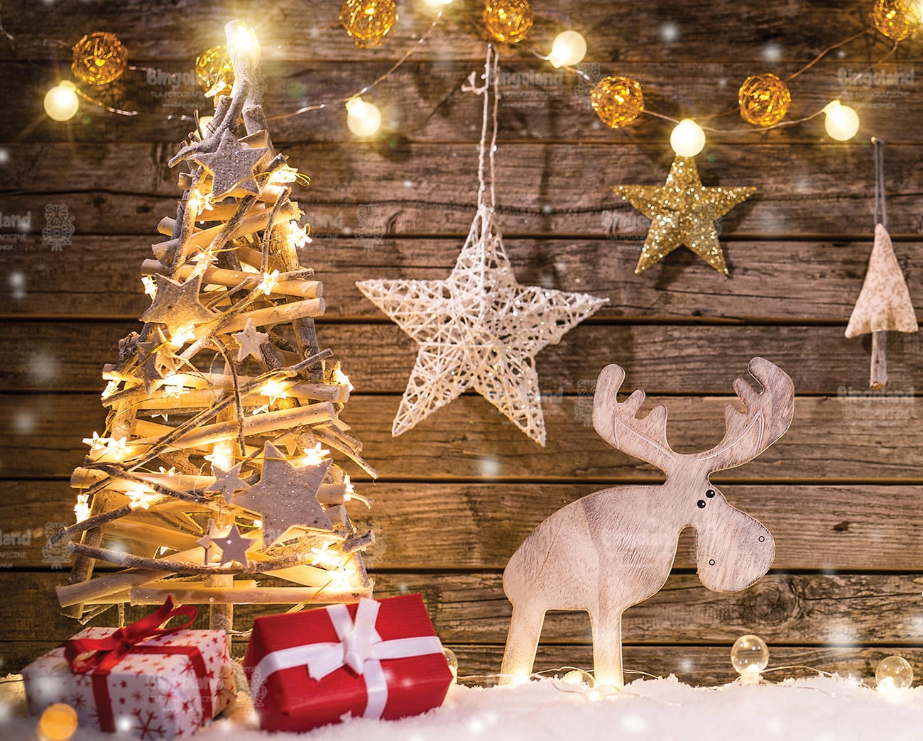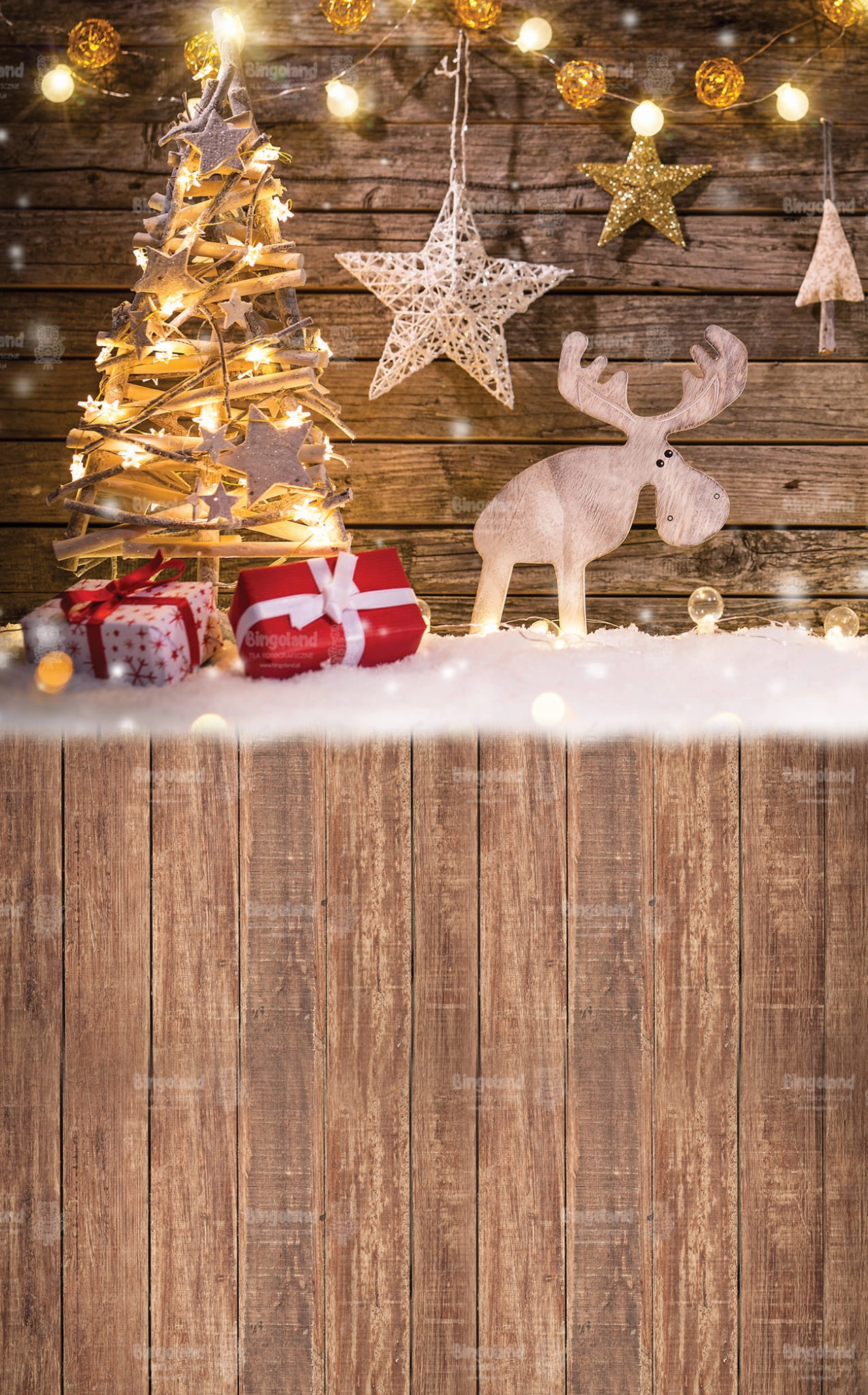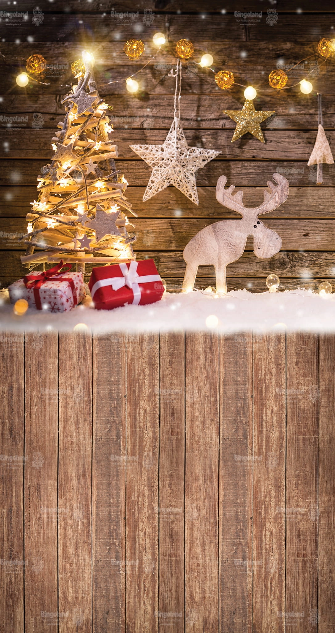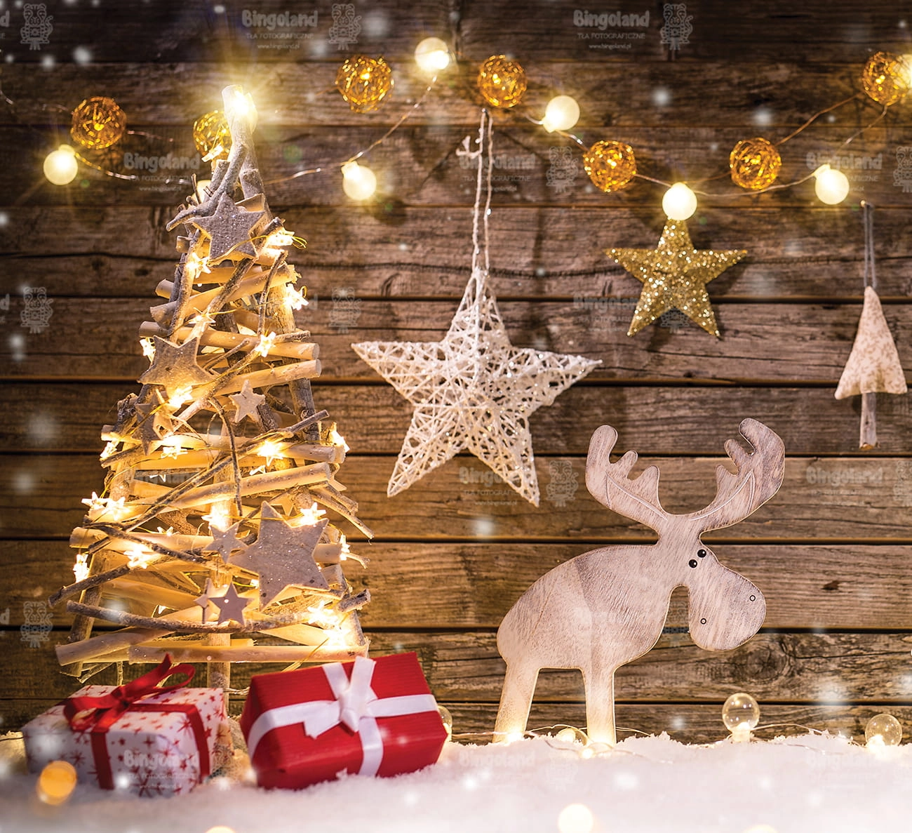 Świąteczne Tło Fotograficzne Bożonarodzeniowe prezenty choinka światełka