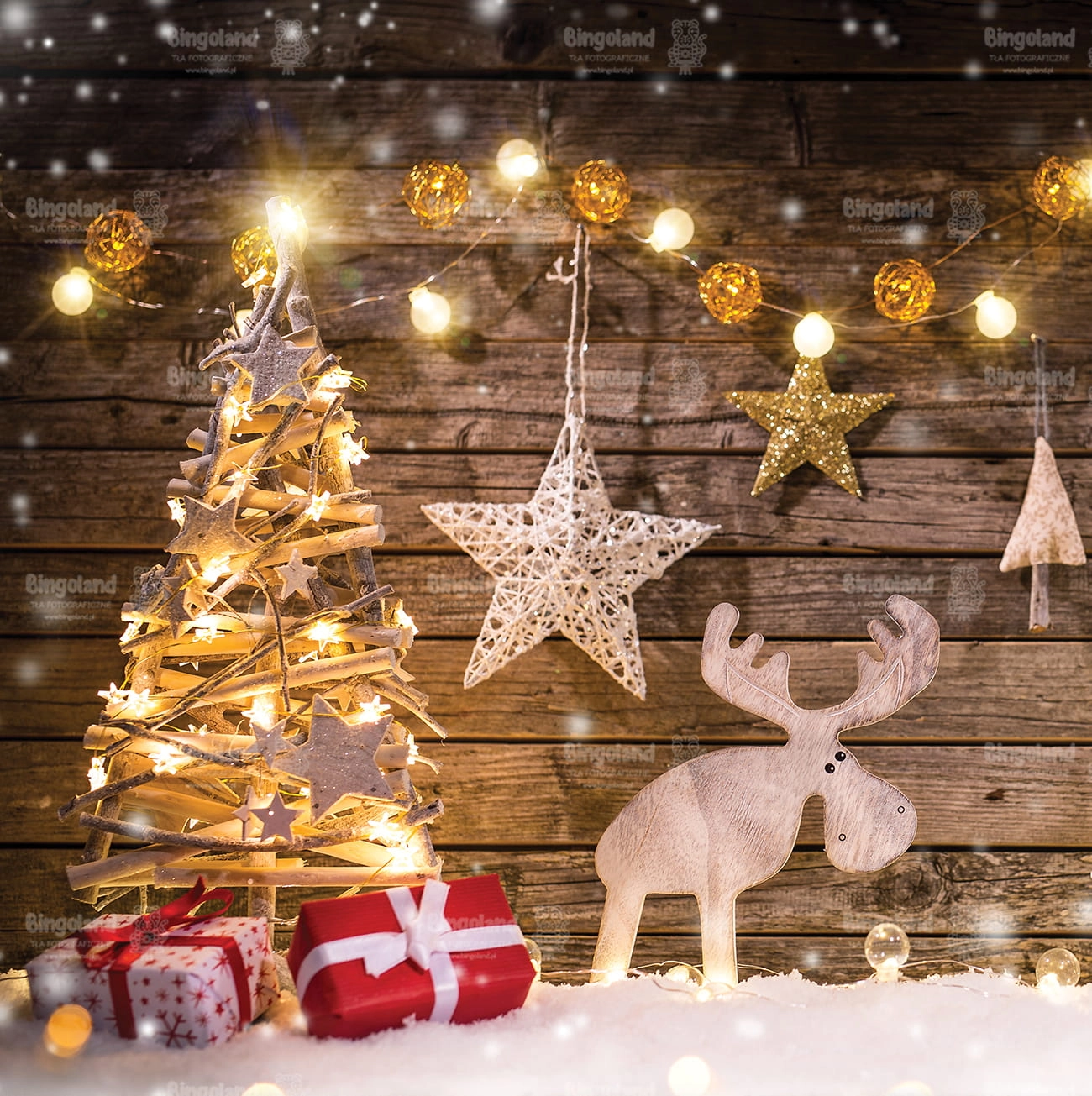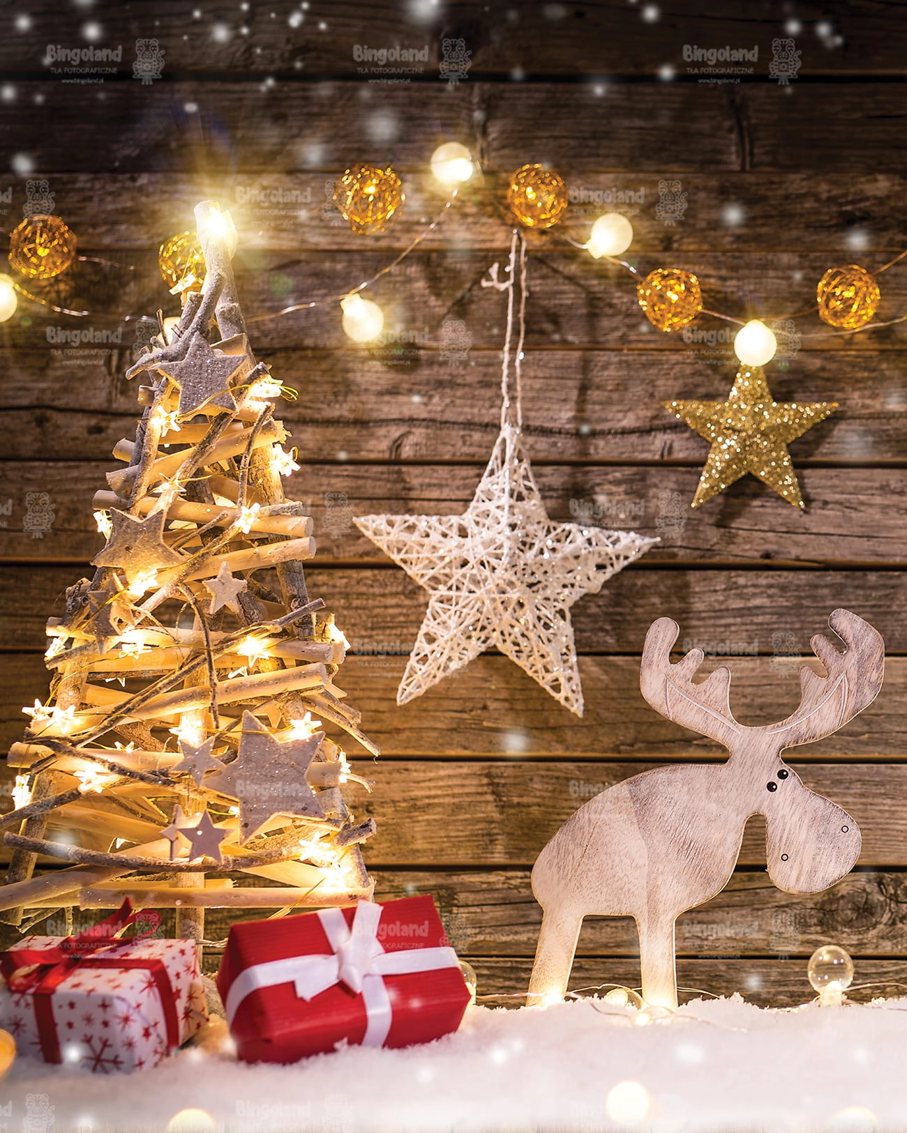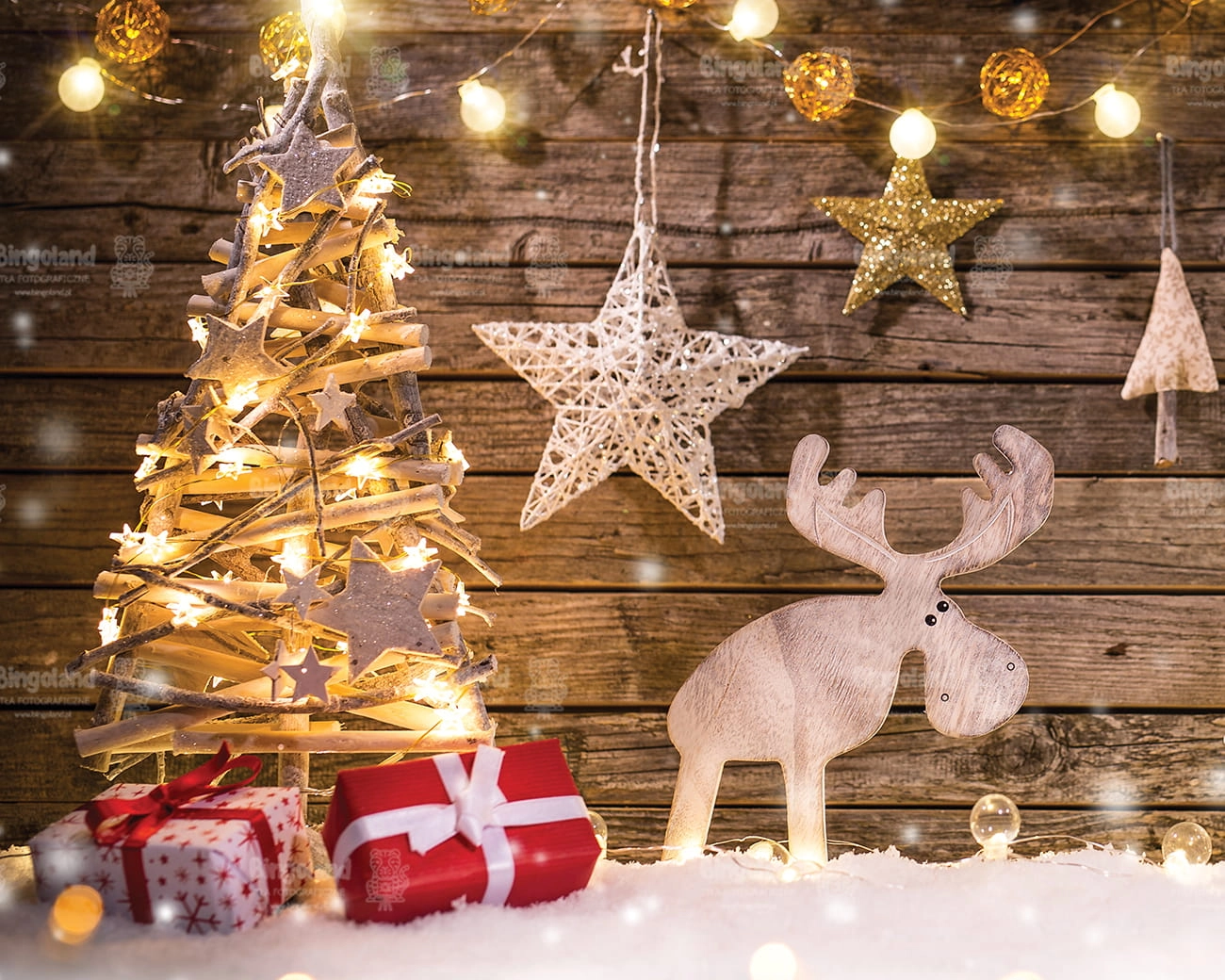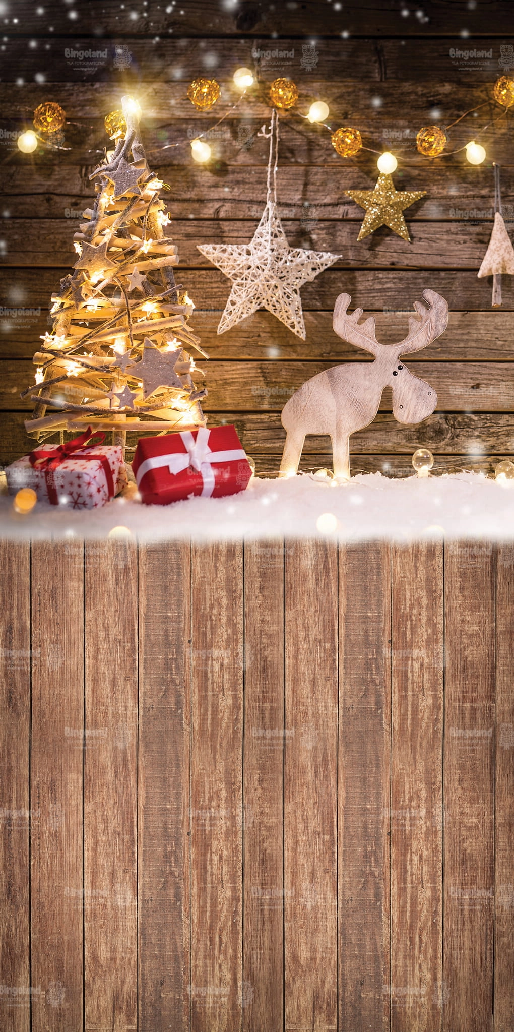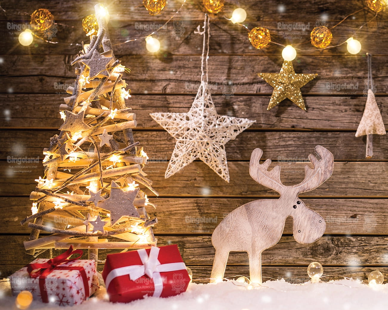 Świąteczne Tło Fotograficzne Bożonarodzeniowe prezenty choinka światełka