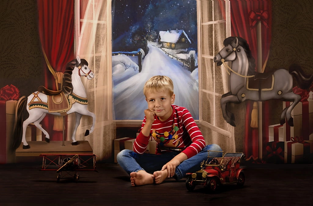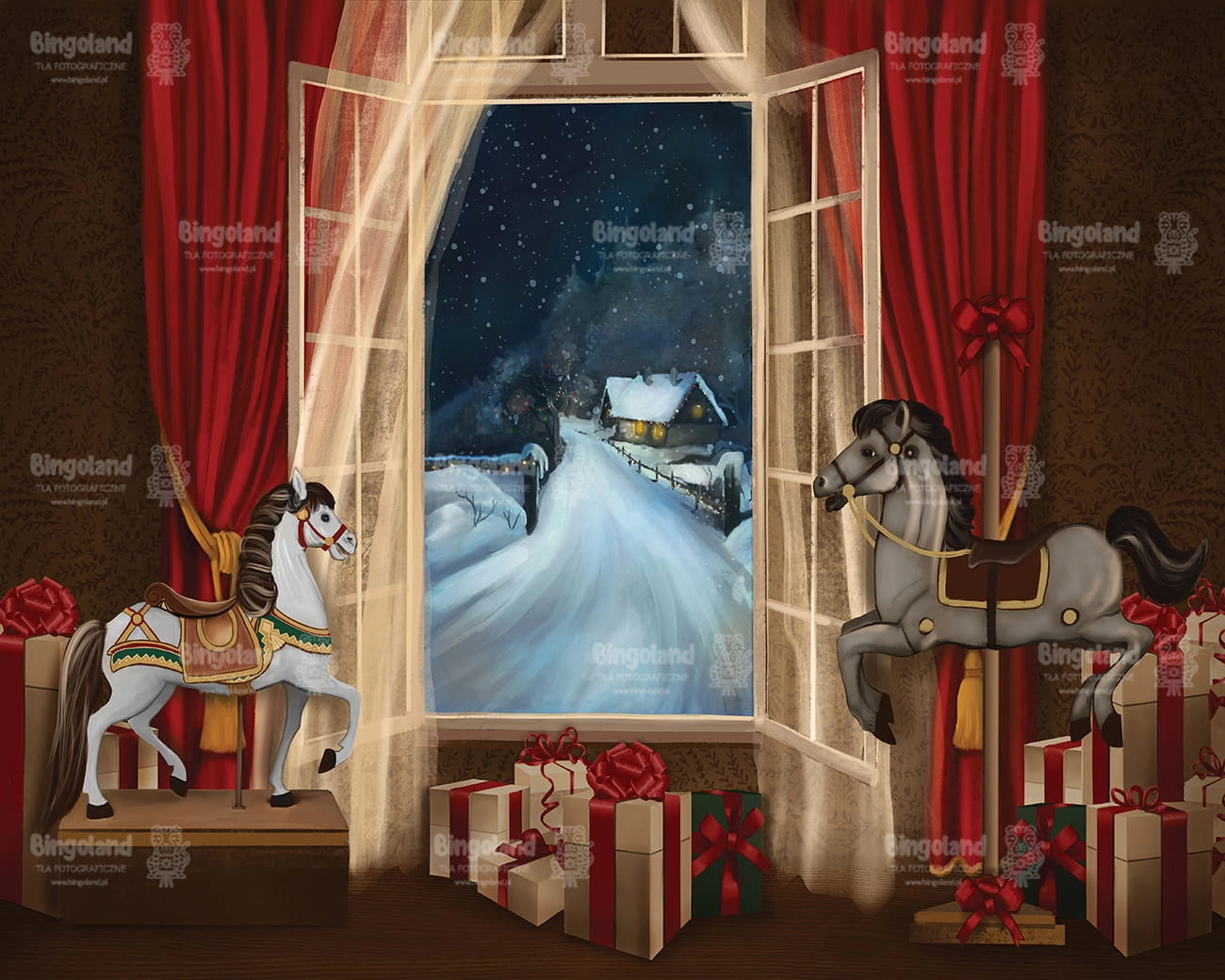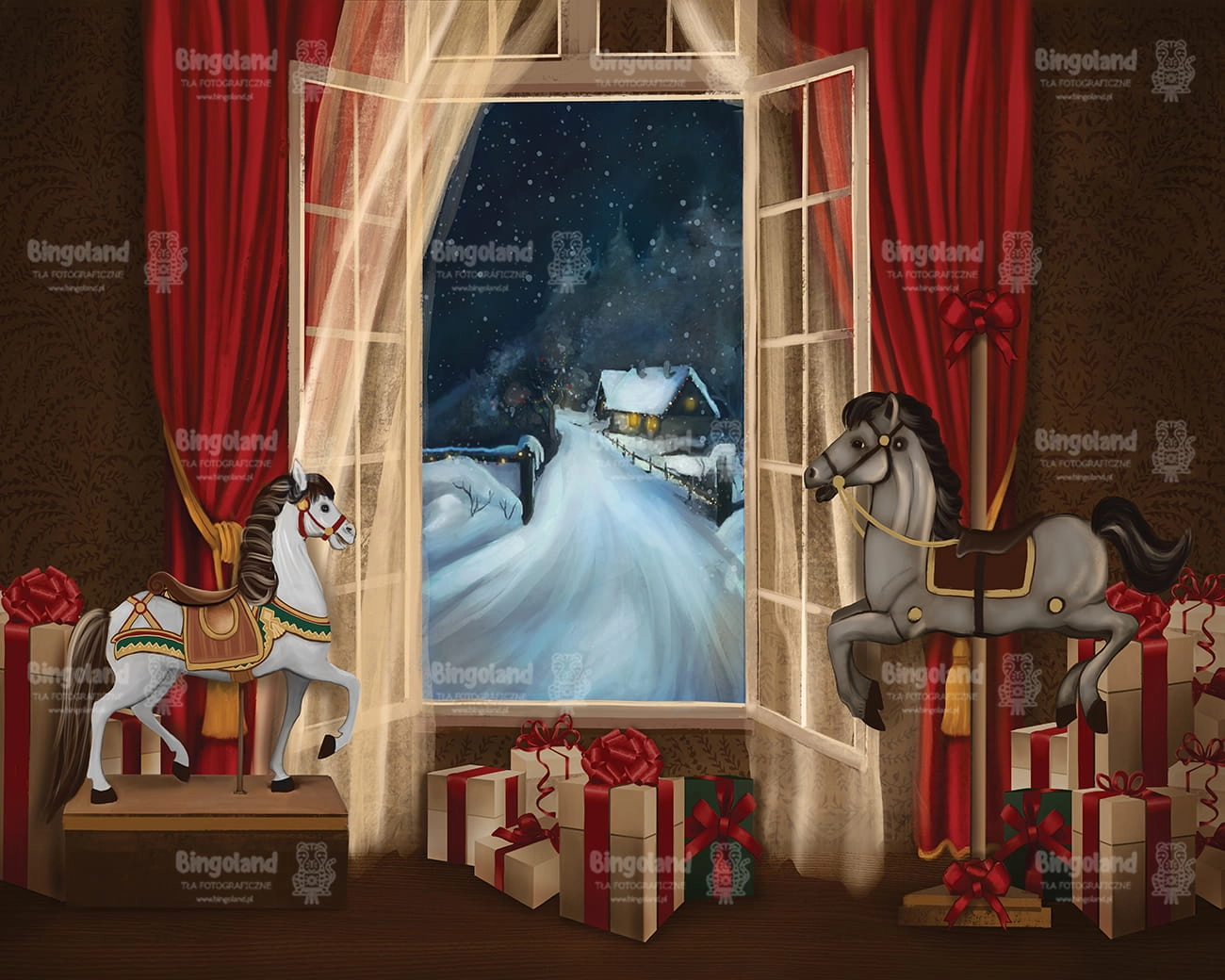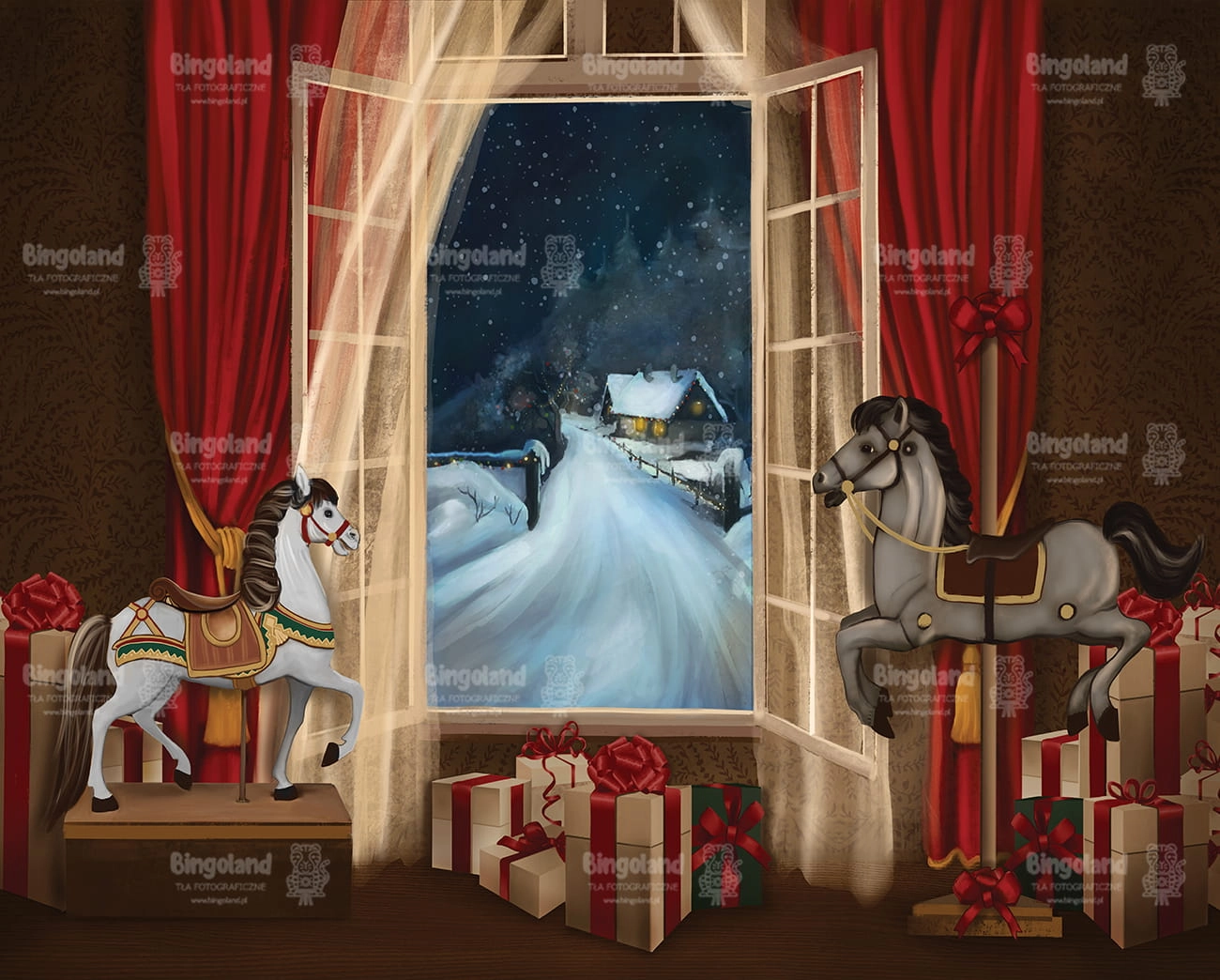 Tło fotograficzne świąteczne , Boże Narodzenie , zabawki , konie , okno . Tło do zdjęć Świątecznych.