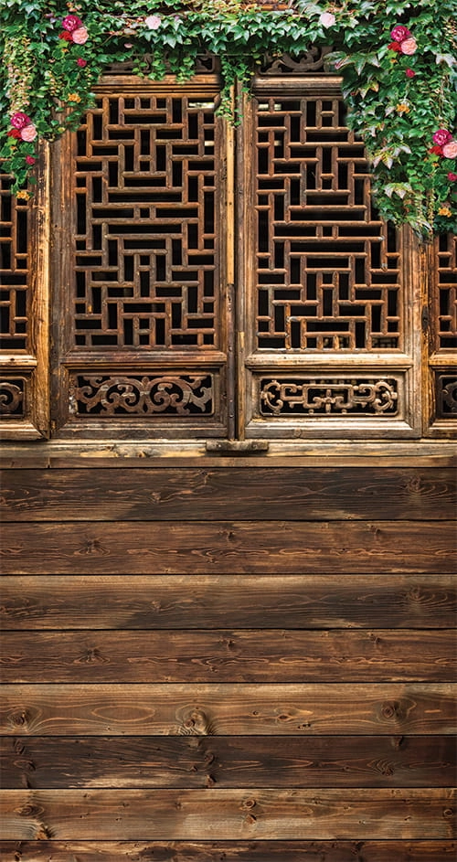 Tło fotograficzne brązowe drzwi w orientalnym stylu , udekorowane bluszczem oraz kwiatami , idealne do sesji komunijnych , jako ścianka na wesele oraz do zdjęć wiosennych
