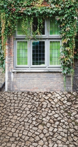 Tło fotograficzne komunijne , zielone okno , porośnięte bluszczem to wzór który fajnie sprawdzi się w sesjach komunijnych , realistyczny efekt da kostka brukowa która znajduje się na podłodze , wzór za równo dla chłopców jak i dziewczynek.